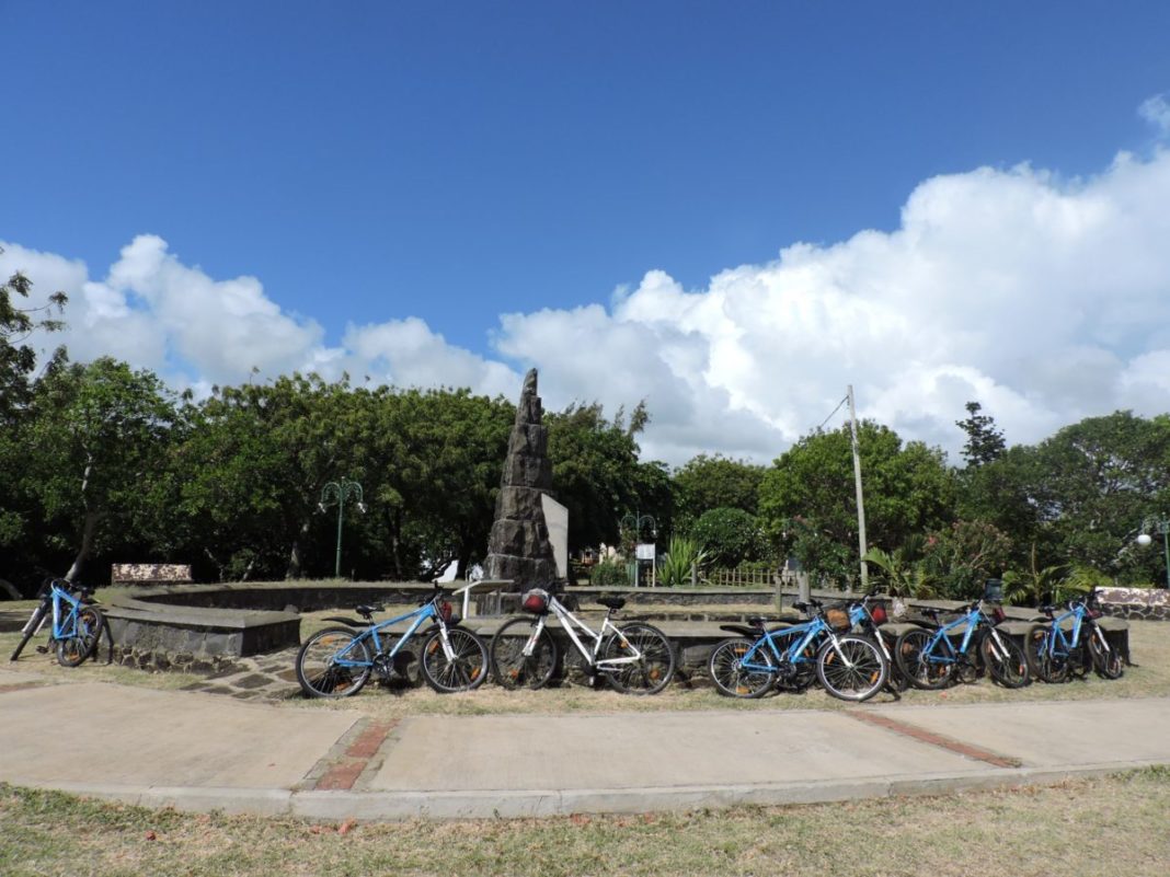 A peine installés sur nos vélos, direction la stèle de « Paul et Virginie ». Monument hautement symbolique du village, cette stèle commémore le naufrage du Saint-Géran en 1744 au large du village. Bernardin de Saint-Pierre avait immortalisé ce naufrage dans son roman éponyme. Le célèbre auteur y raconte l’histoire de ces deux amoureux. Virginie quitte la France à bord du Saint Géran, le navire qui doit la ramener à l’île Maurice, retrouver son amoureux, Paul. Pris dans une tempête, le navire s’échoua sur les rochers sous les yeux de Paul.  De désespoir, il succombe à la perte de sa bien-aimée.