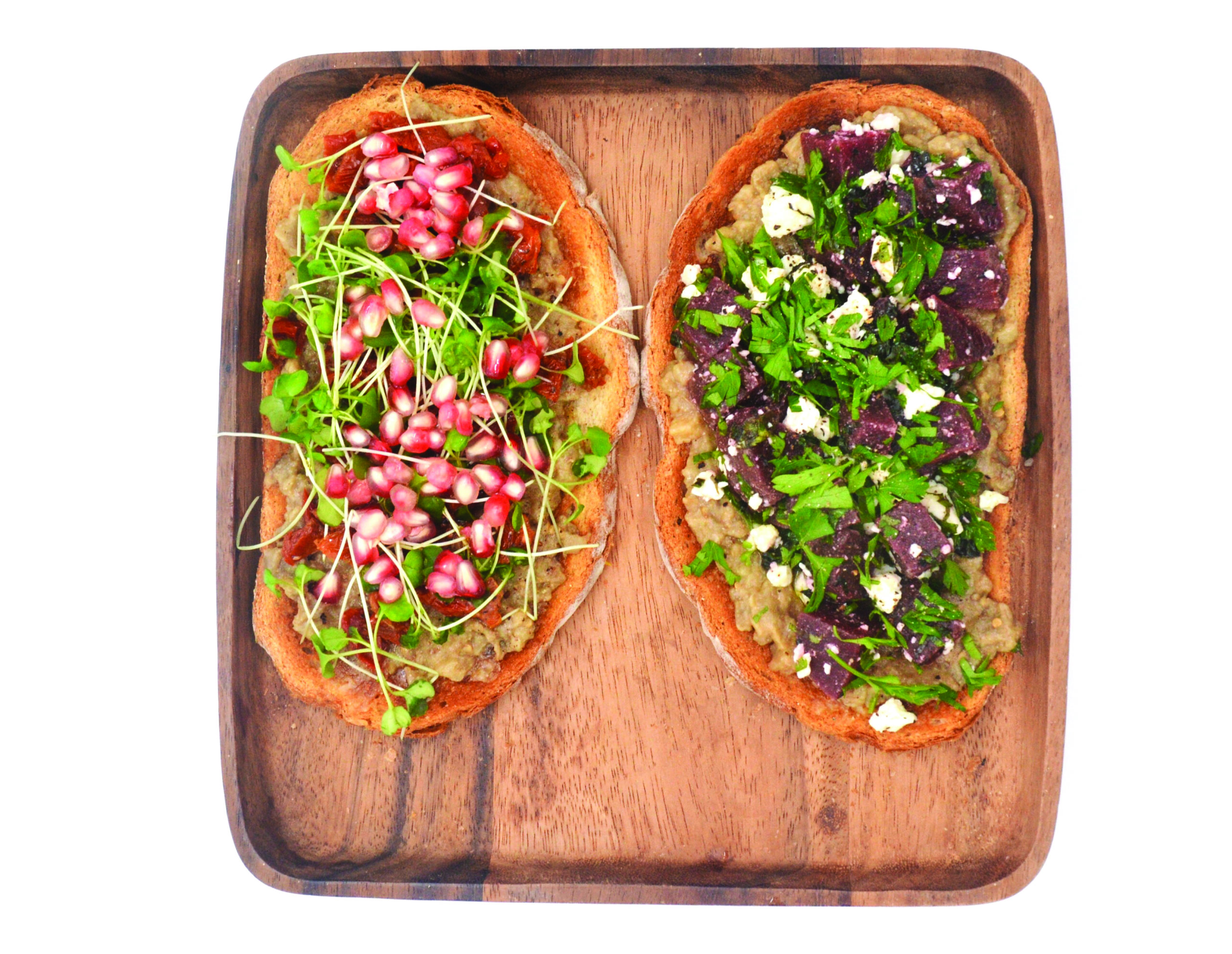 - Sur le toast, étaler un peu d’ail confit. Le tartiner de baba ganoush Mingle.mu, et ajouter un peu du mélange betterave-feta-menthe-persil-huile d’olive. Servir frais.
