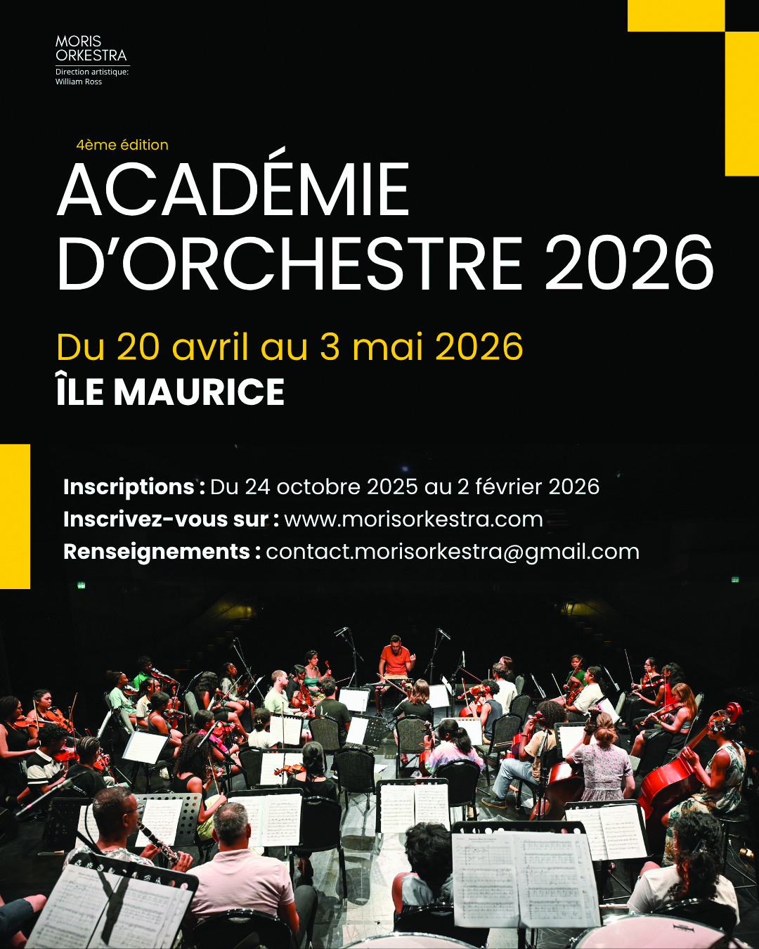 Under the leadership of Élodie Labonne, the Akademi Moris Orkestra Association now has just a few administrative formalities to complete before coming into full existence. Anchored in Mauritius, this structure will support the Moris Orkestra ‘s actions in Mauritius by supporting the development of orchestral and chamber music academies, strengthening local partnerships and access to grants, and ensuring the outreach of this unique initiative. Oyé musicians up to the age of 35: registrations are in full swing for the 4th orchestral academy, to be held from April 20 to May 3, 2026 , culminating in three concerts at the Caudan Arts Centre. To take part and play in this dynamic, cosmopolitan orchestra specializing in symphonic sega, register online under Orchestral Academy “, and send in your video. Moris Orkestra will also extend its activities to senior citizens and the otherwise able, andallow children to enter the heart of the orchestra…