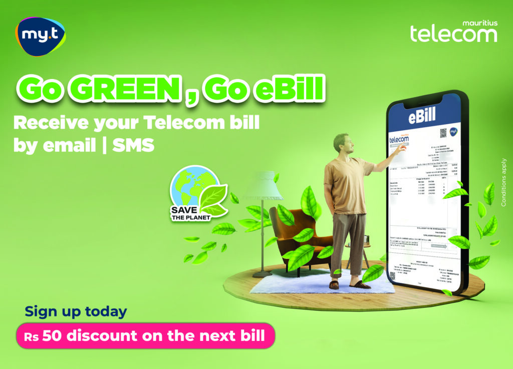 Mauritius Telecom encourages its customers to go green with my.t eBill. This digital solution enables users to receive, manage and pay their MT bills with ease, online or via the my.t care app, without leaving home.