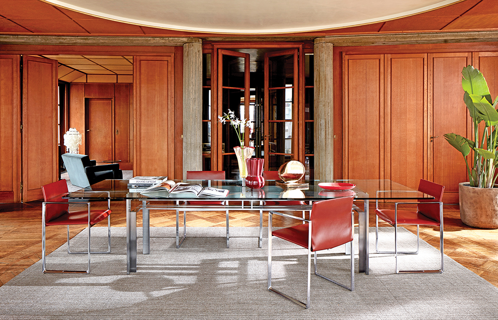 La table Doge, conçue par Carlo Scarpa, fait partie de la Collection Cassina Simon Collezione. Table avec structure en aluminium anodisé (aluminium poli, nickel-gris foncé poli, cuivre poli ou rouge mat). Les plans sont en verre flotté pour toutes les dimensions ou bien en deux versions de marbre.
