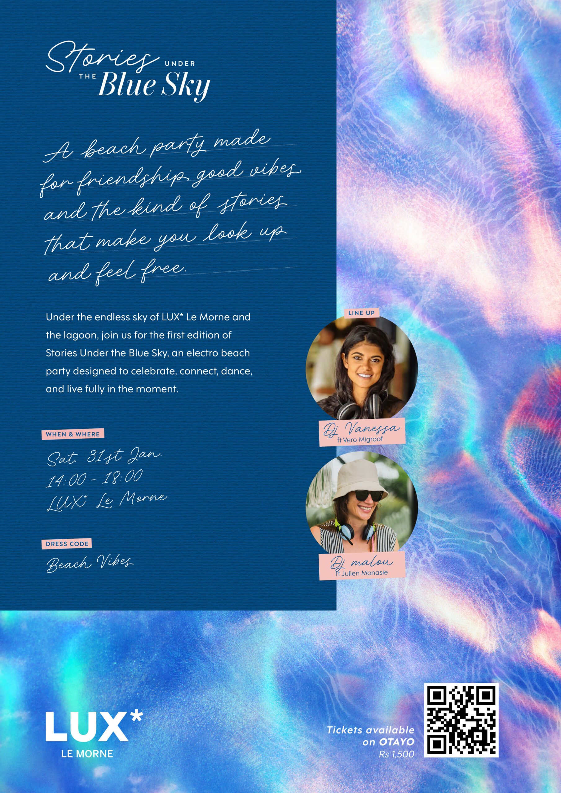 Le 31 janvier 2026, LUX* Le Morne donnera le coup d’envoi de Stories Under the Blue Sky, une nouvelle série de beach parties imaginées pour les Mauriciens et résidents de l’hôtel. Au programme : ambiance électro solaire, DJ sets, performances live et cocktails signatures face au lagon !