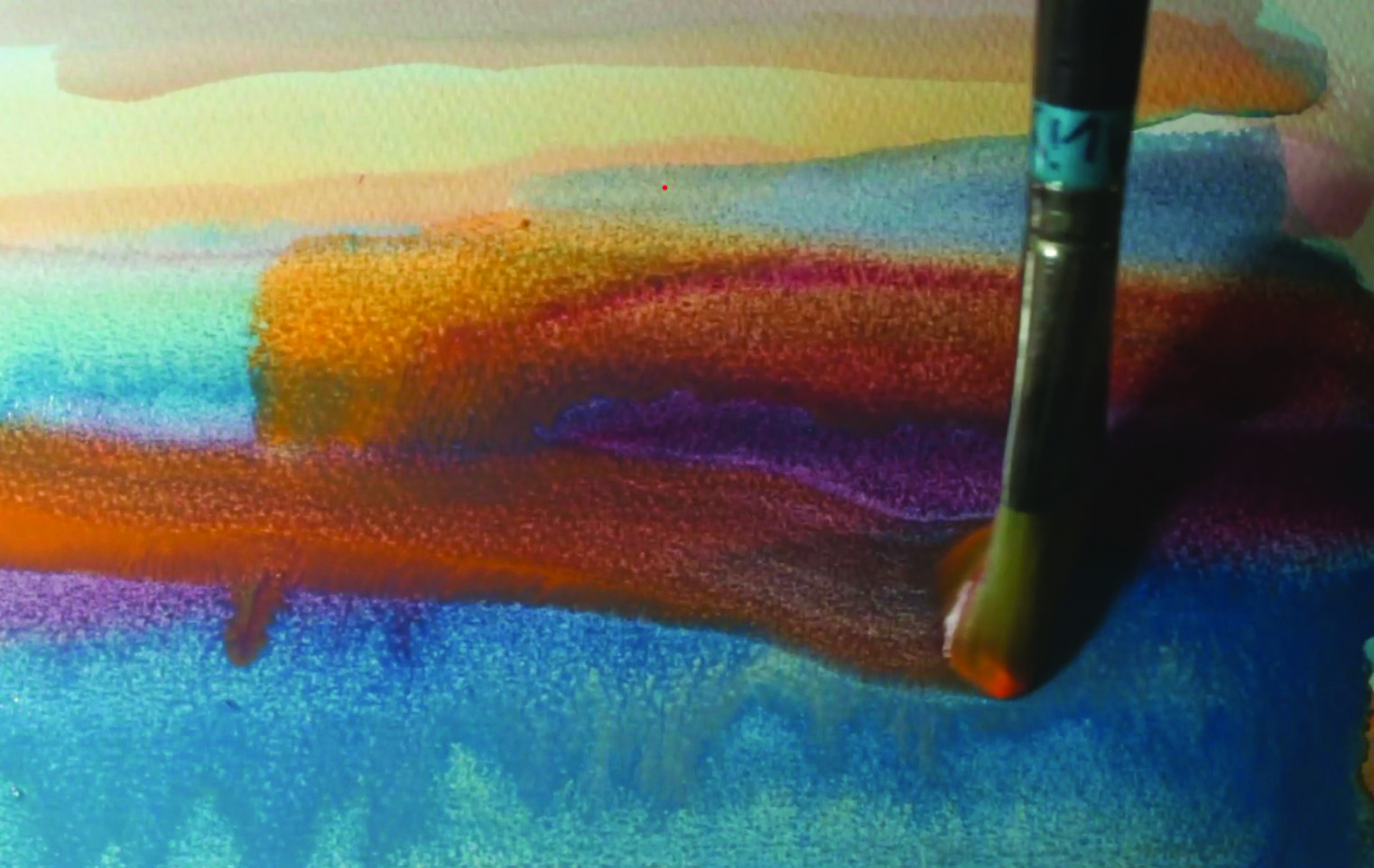 Chez l’artiste, ce phénomène devient un procédé créatif volontaire… Au coucher du soleil, de grandes traces horizontales couvrent le papier de jaune et de rouge, sur Dream de Cage. Le mouvement du pinceau est souple et serein, l’orange resplendit sur le bleu, puis l’image prend de la profondeur au second mouvement. La peinture ajoute à la magie de cette musique composée pour Merce Cunningham. Sur « Île de feu I », une des études rythmiques de Messiaen, des silhouettes humaines aux gestes vifs illustrent cette musique modale dédiée à la Papouasie Nouvelle-Guinée, quand, pour « Arc-en-ciel » de Ligeti, les jeux de lumière miroitent les sons sur des palmiers dans le vent et des canopées filtrant les rayons du soleil. Les mouvements des morceaux, leur thème, leur rythme et bien sûr leur mélodie suscitent des émotions qui guident la main d’Alix, la vivacité de son pinceau, le choix des couleurs et motifs. L’objectif est de dialoguer avec la musique : les images se font et se défont d’instant en instant…