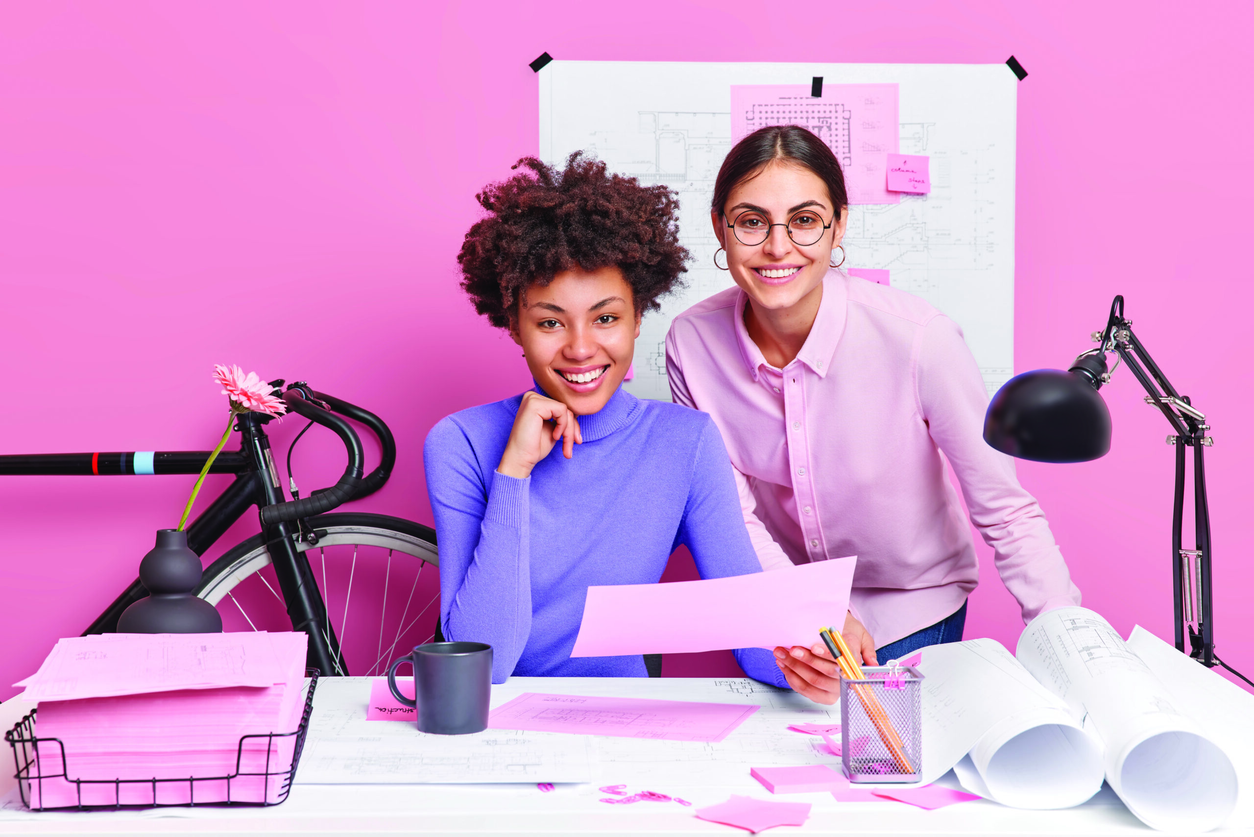 Two diverse creative women collaborate together for making blueprints work on new project pose at coworking space enjoy their occupation isolated over pink background. Women creative workers in office