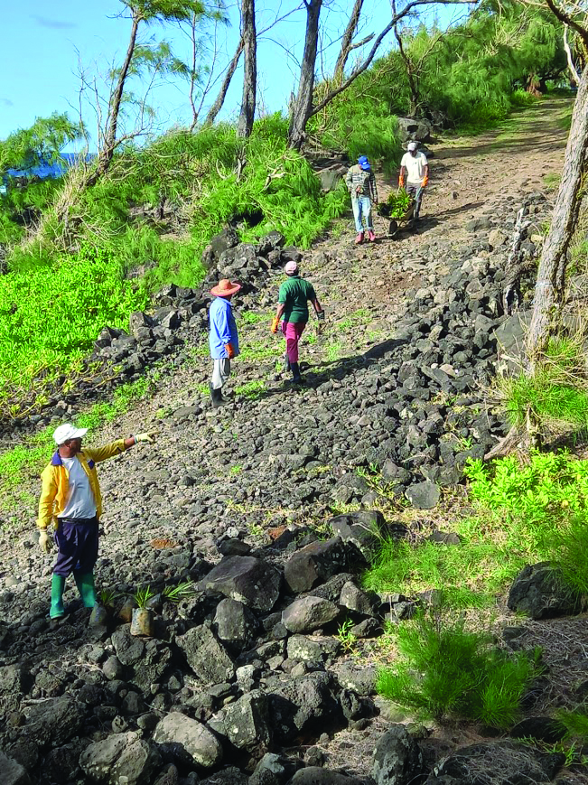 Si verdoyant soit-il, le littoral sud a lui aussi perdu sa biodiversité, mise à mal par l’invasion des plantes exotiques, à l’instar des filaos qui, certes, brisent le vent, mais facilitent aussi l’érosion en envahissant et acidifiant les sols, empêchant d’autres espèces de s’épanouir. Les activistes de mru2025 rêvent de voir ces plantes envahissantes remplacées par des feuillus endémiques adaptés à ces côtes escarpées et au puissant souffle salin de la région. Ils s’attèlent à rétablir la biodiversité végétale en renforçant la réserve de Virginia, étendue à 5 hectares depuis 2023, et en élargissant ce reboisement aux abords du sentier littoral.